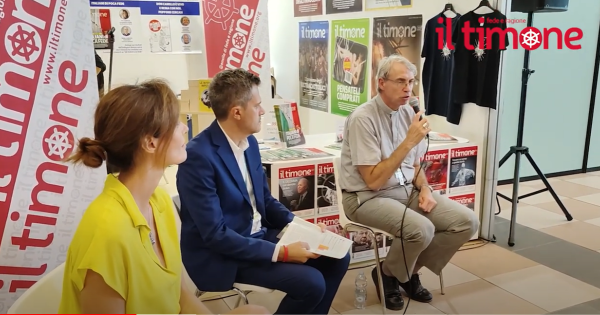 Mons. Corrado Sanguineti, vescovo di Pavia, e Eva Crosetta, conduttrice di Sulla via di Damasco (Rai3) allo stand del Timone al Meeting 2023