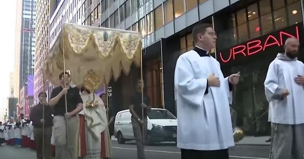 Grazie al Napa Insitute, centinaia di persone hanno marciato in raccoglimento, seguendo un grande ostensorio dorato che veniva portato in alto, attraverso le trafficate strade di Manhattan, passando anche davanti allo storico Radio City Music Hall, mentre alcuni spettatori si inginocchiavano in adorazione. Padre Mike Schmitz, sacerdote della diocesi di Duluth e popolare oratore e podcaster cattolico, ha celebrato la Messa in apertura della processione, nella cattedrale di San Patrizio, sede dell'arcidiocesi di New York. A lui si sono uniti decine di sacerdoti provenienti da tutto il Paese e anche Edmund Whalen, vescovo ausiliare di New York.
