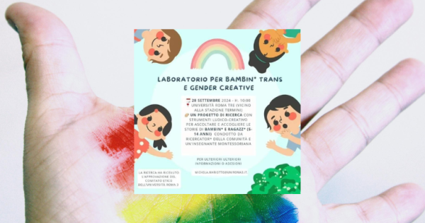 “Laboratorio per bambin* trans e gender creative - storie di bambin* e ragazz* trans dai 5 ai 14 anni”. Questo il titolo dell’evento che si terrà il prossimo 28 settembre alle ore 10 presso l’Università di Roma Tre, nella sede a pochi passi dalla stazione Termini. In locandina, oltre a un’inflazione di asterischi e una confusione linguistica generalizzata, si specifica che il tutto sia stato approvato dal Comitato etico dell’Università di Roma Tre.